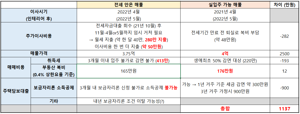 매매가 자체에서 워낙 차이가 많이 나다보니, 다른 모든 비용을 고려하더라도 전세를 끼고 매수를 하기로 결정할 수 밖에 없었다.